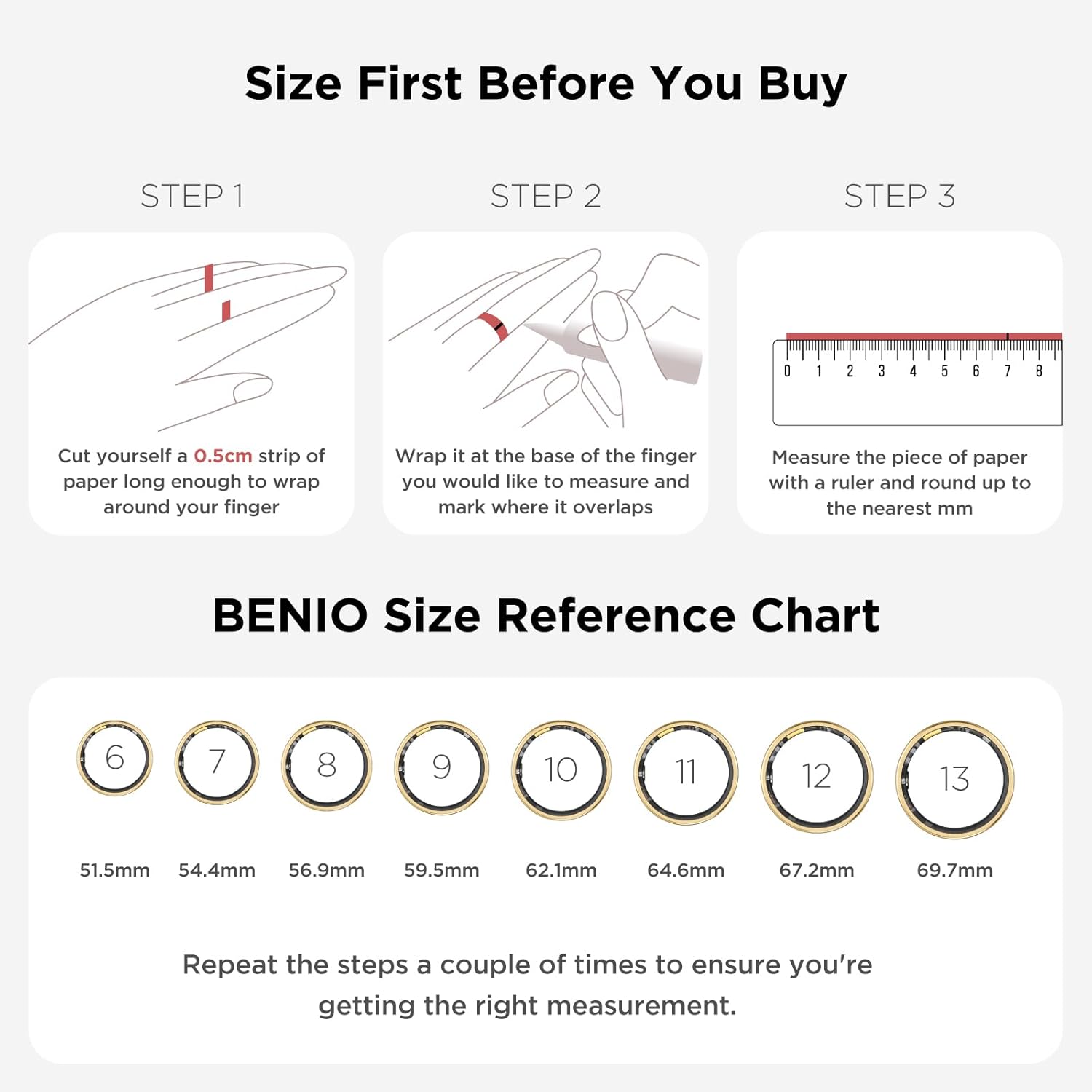 【Find Your Fit First】Before purchasing Benio, we recommend ordering our sizing kit to try on. If you prefer not to use the kit, please refer to the size chart and measure your finger circumference for a more comfortable fit.