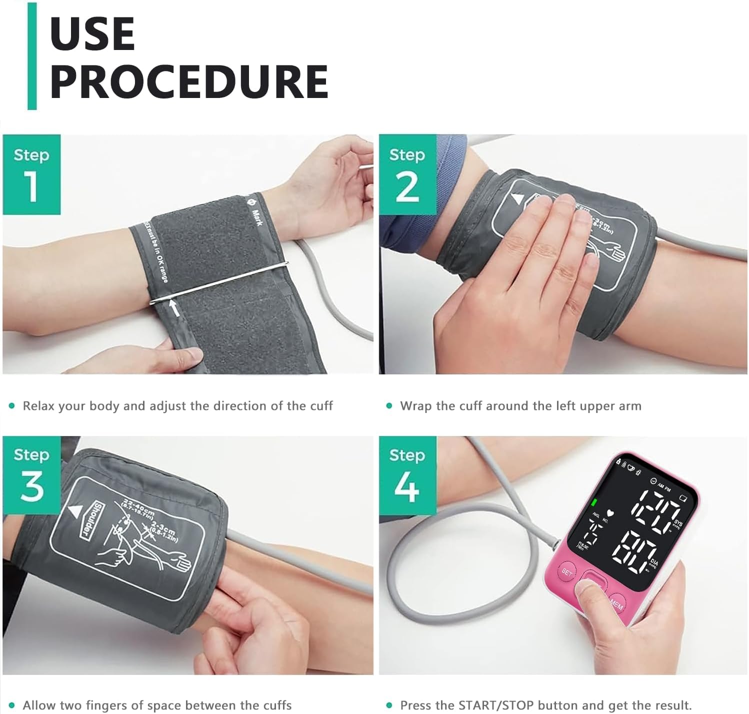 Adjustable Arm Cuff: The arm cuff range from 8.7 – 15.7 inches (22-40 cm) fits your size, ensuring a comfortable and secure fit for most adults