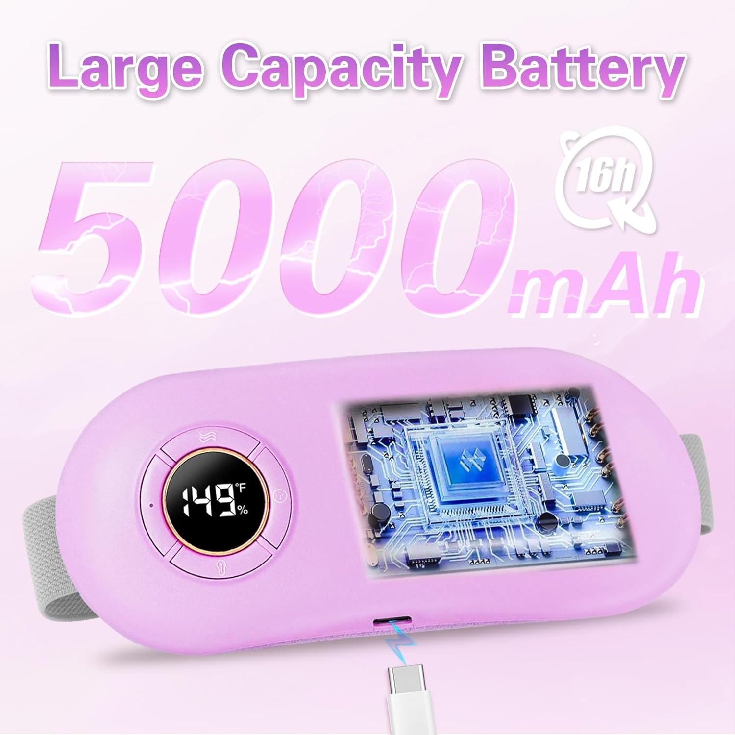 【5000mAh Battery】This portable cordless heating pad is charged by Type-C, it can be used continuously for about 8 hours after being fully charged.