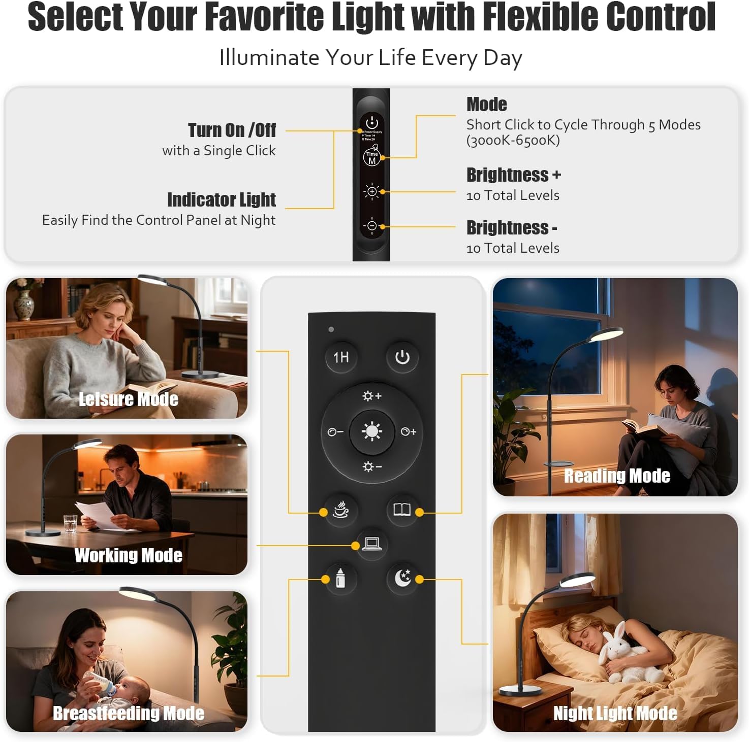 DUAL – CONTROL AND TIMER FUNCTION: Equipped with touch and remote control, adjust the light both up close and from a distance. For added convenience, it has 1H and 2H timer settings, and an auto “Wake – Up Mode” that turns the light on for 30 minutes after 8 hours. You can adjust the color temperature and brightness from any angle and switch among 5 scene modes including leisure, work, breastfeeding, reading, and night light remotely. It’s a great choice for those searching for led floor lamps