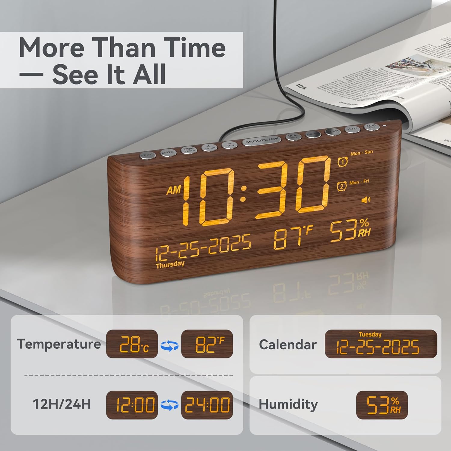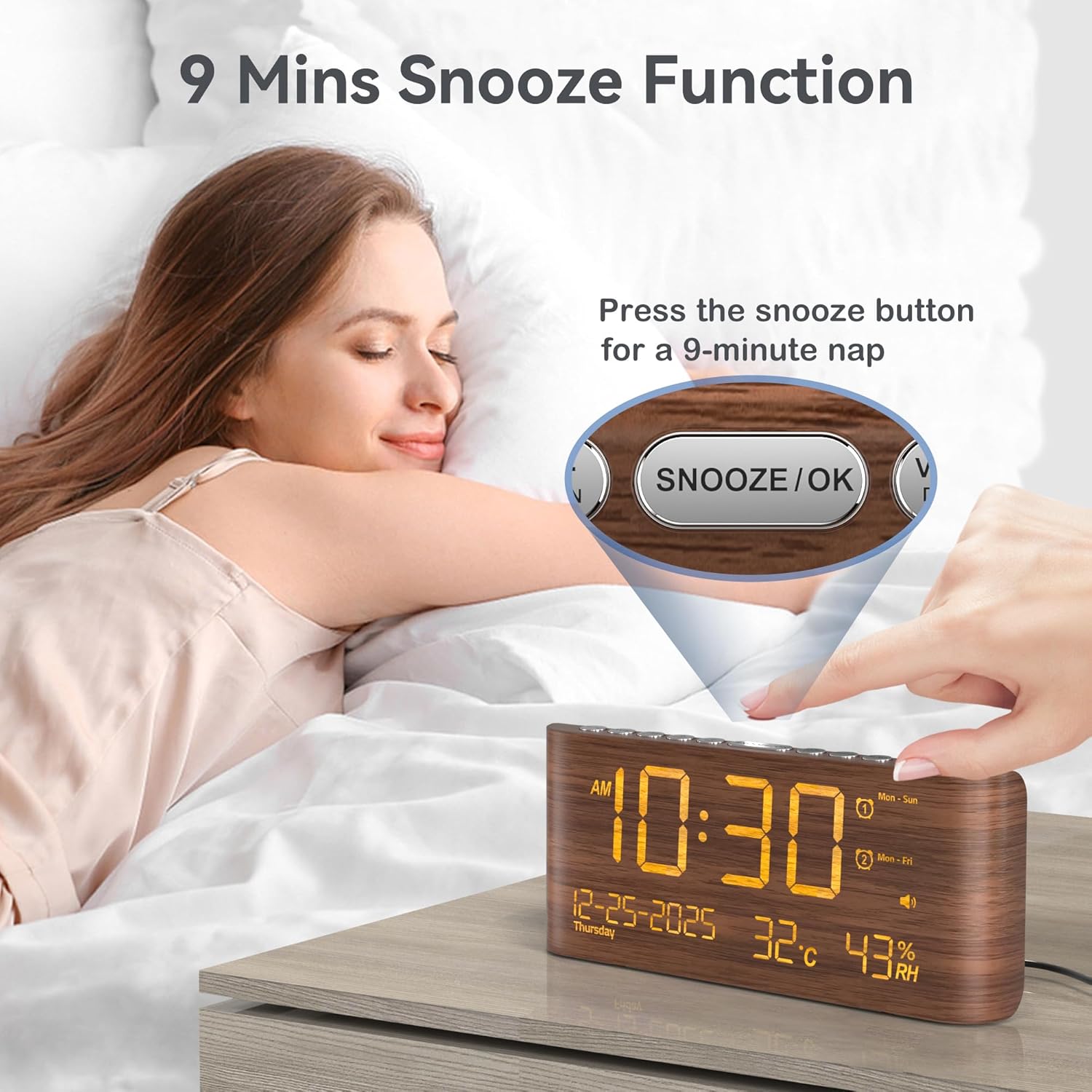 6 reviews for Mesqool Digital Alarm Clock for Bedroom with Date Temperature and Humidity, Dual Alarms,Loud Volume, USB and Type-C Charging Ports (Brown)