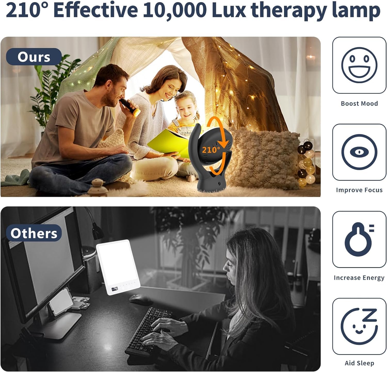 【210° Adjustable Lighting Angle】This light therapy lamp features design and 210° adjustable lighting angle to find the most suitable lighting direction for you, you can easily adjust the lamp to shine light on your face, body, or any other area that needs a boost of natural light. Let your body fully enjoy the energy brought by the sun lamp, which will help you beat the blue winter easily.