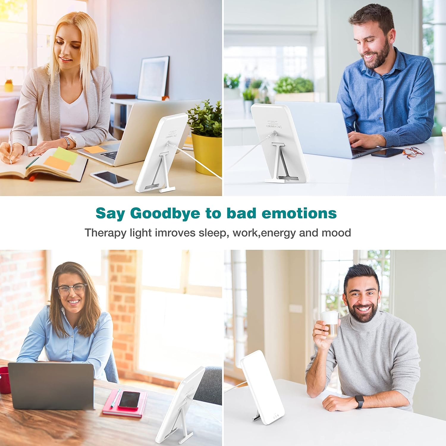 【Upgraded Light Therapy Lamp】Simple and atmospheric appearance, soft and adjustable lighting, imitating the full spectrum of sunlight light. This light lamp is full and consistent across the panel with no shadows. In addition, this light box is wonderfully bright at full force and help you feel more cheerful on dreary days.